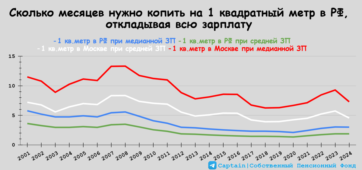 Высчитать ее среднее значение не представляется возможным, однако можно заключить в уме, что в начале 00-х людям требовалось меньшее количество месяцев для покупки 1 кв. метра.