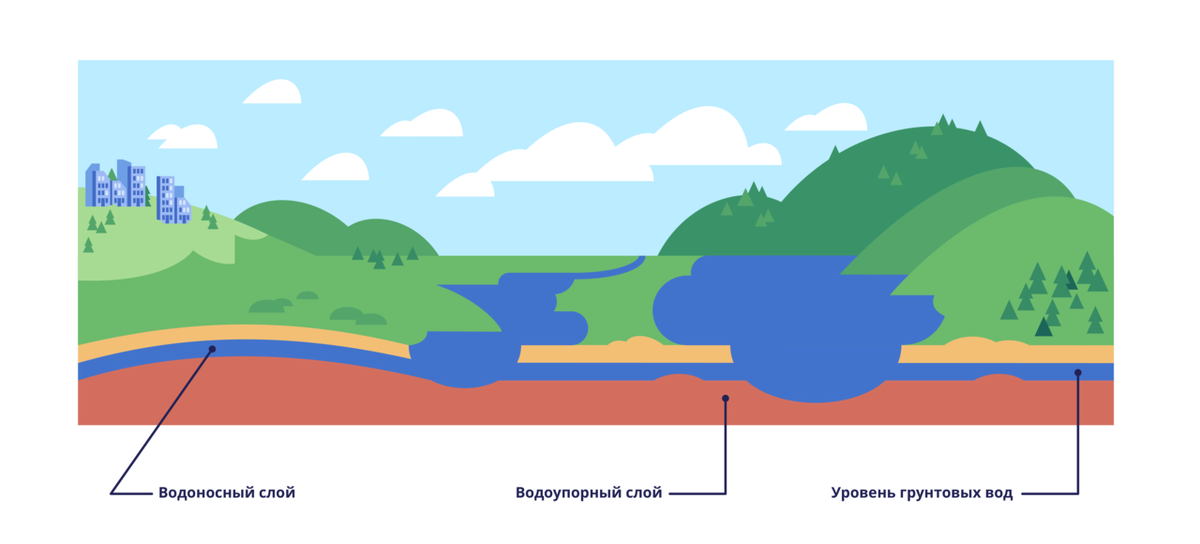 - Грунтовые воды залегают на первом от земной поверхности водоупорном слое, их уровень и степень загрязнения изменяется по сезонам года. Грунтовые воды используются в колодцах.