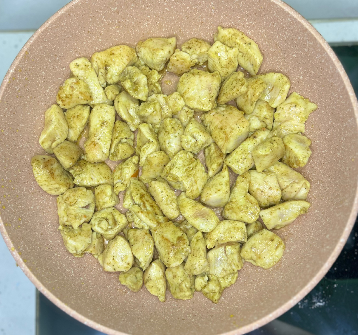 Обжарка курицы. Кусочки куриного филе перемешать со специями .На сковороде разогрейте растительное масло, обжарьте куриное филе на среднем огне до изменения цвета (примерно 5–7 минут). Чем дольше куриное филе подтверждается термической обработке , тем оно суше и жёстче.