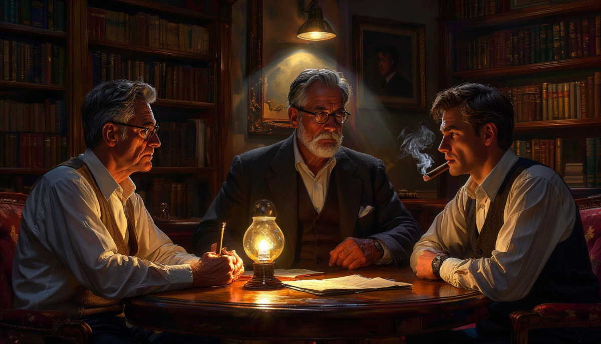 Комната была наполнена ароматом старой бумаги и крепкого табака. Тени от высоких книжных стеллажей сплетались в причудливые узоры на стенах, а мягкий свет настольной лампы очерчивал круг, в котором сидели мы трое. Два моих давних собеседника и я. Казалось, сама обстановка располагала к тихой, глубокой беседе, лишенной суеты.
