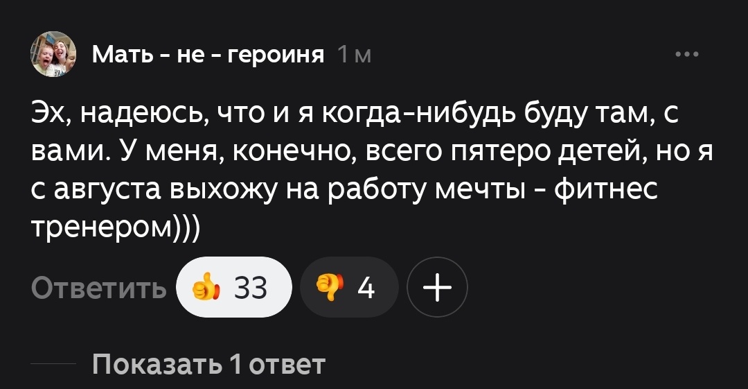 "Эх, надеюсь, что и я когда-нибудь буду там, с вами. У меня, конечно, всего пятеро детей, но я с августа выхожу на работу мечты – фитнес-тренером)))".