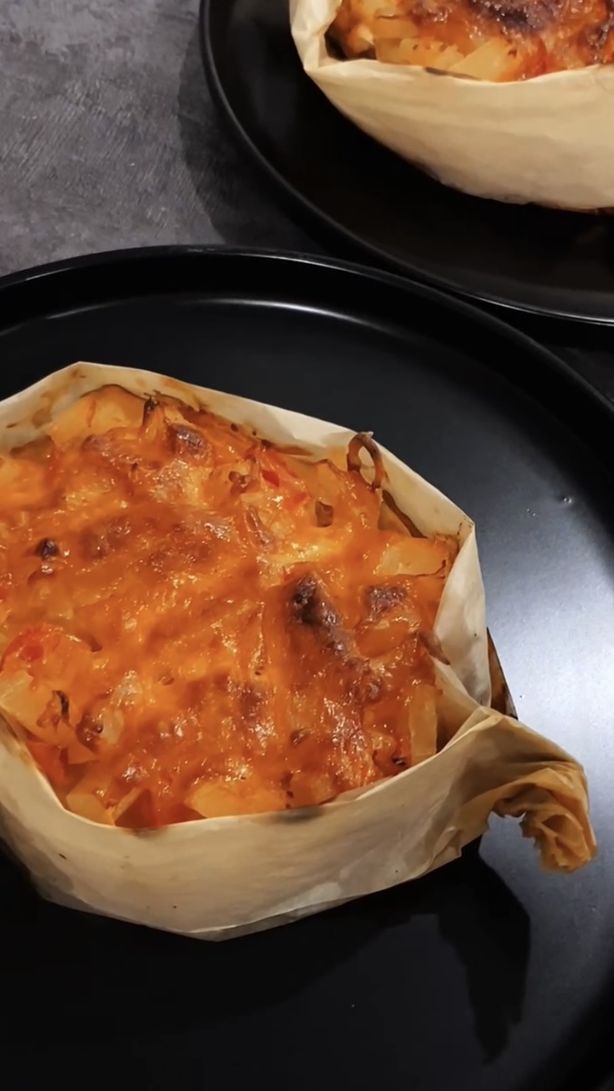 Нам понадобятся: А также пергамент для создания формочек, или же можно купить готовые. Первым делом собираем лодочки из пергамента. Это сделать легко - сначала сворачиваем бумагу гармошкой, а затем загибаем уголки и раздвигаем серединку, придаем форму. Также можно перевязать края веревочкой для большей прочности. Теперь подготавливаем все продукты. Первым делом нарезаем мясо кубиками, добавляем специи по вкусу, у меня - соль, перец, паприка, добавляем масло, все тщательно перемешиваем и отправляем мариноваться в холодильник. В это время нарезаем картофель, помидоры, ананасы и натираем сыр. Подготавливаем наш соус: соединяем томатную пасту, майонез и горчицу. Когда все готово достаем наше замаринованное мясо и приступаем к укладке слоев. Лодочки смазываем маслом. Первый мой слой из картофеля, смазываю его нашим соусом, следом отправляю куриное филе, смазываю соусом. Следующий слой опять картофель, но это не обязательно , можно сделать один нижний слой, также смазываю соусом и отправляю