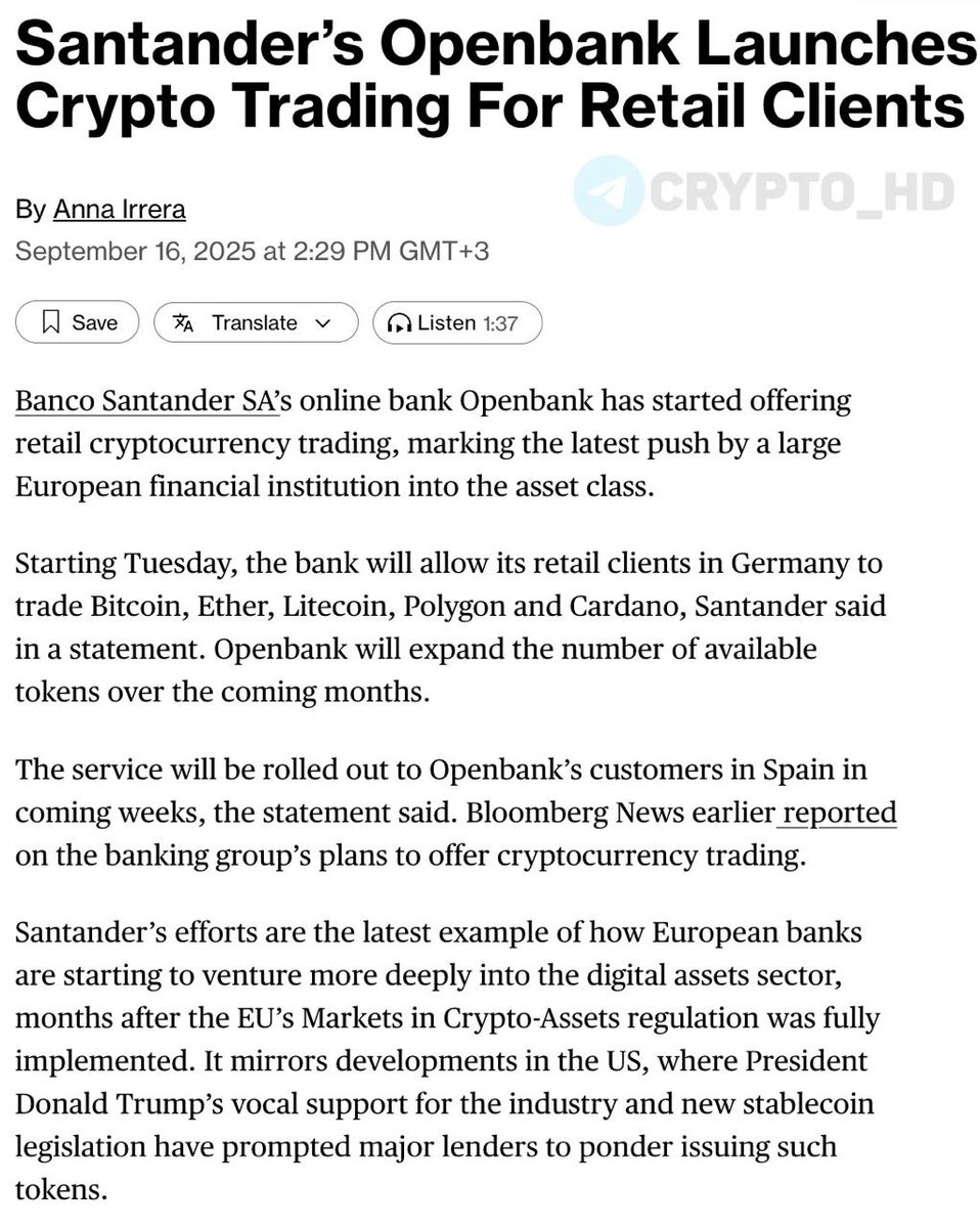 πͺπΈ Bloomberg: ΠΡΡΠΏΠ½Π΅ΠΉΡΠΈΠ΅ Π±Π°Π½ΠΊ ΠΡΠΏΠ°Π½ΠΈΠΈ Banco Santander S.A. ΠΎΡΠΊΡΡΠ» ΡΠ²ΠΎΠΈΠΌ ΠΊΠ»ΠΈΠ΅Π½ΡΠ°ΠΌ Π΄ΠΎΡΡΡΠΏ ΠΊ ΡΠΎΡΠ³ΠΎΠ²Π»Π΅ ΡΠΎΠΊΠ΅Π½Π°ΠΌΠΈ #BTC, #ETH, #LTC, #POL ΠΈ #ADA ΡΠ΅ΡΠ΅Π· Π΄ΠΎΡΠ΅ΡΠ½ΡΡ ΠΊΠΎΠΌΠΏΠ°Π½ΠΈΡ Openbank. ΠΡΡΠΎΡΡΠΈΠΌΠ΅Π½Ρ ΡΠΎΠΊΠ΅Π½ΠΎΠ² ΠΏΠΎΡΡΠ΅ΠΏΠ΅Π½Π½ΠΎ ΡΠ²Π΅Π»ΠΈΡΠ°Ρ Π² Π±Π»ΠΈΠΆΠ°ΠΉΡΠΈΠ΅ ΠΌΠ΅ΡΡΡΡ. Crypto Headlines