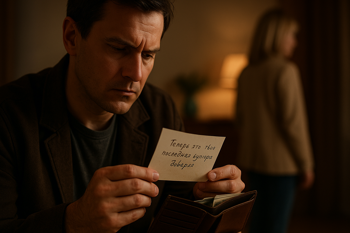 Ночью он вытащил из кармана тот самый кошелёк, который Маша забыла утром — в конце концов, он не шпионил, он просто нашёл. И вложил туда сложенную вдвое карточку из плотной бумаги, на которой черным тонким маркером написал: «Теперь это твоя последняя купюра доверия». Не от злости. От необходимости обозначить ноль.