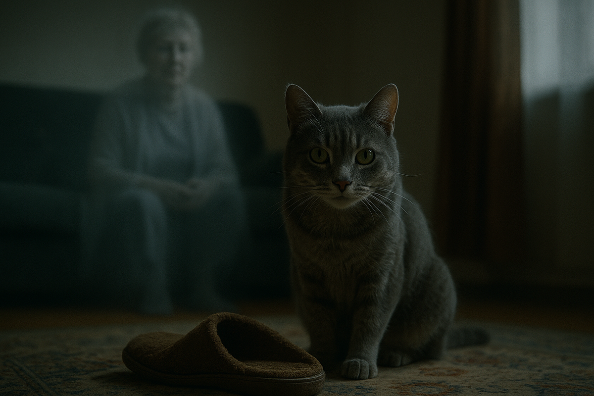 Кошка сидела у тапка, как у иконы. Не молилась — просто была. Как будто охраняла — не тапок, а воспоминание. Чтобы оно не выветрилось. Не ушло следом за хозяйкой.