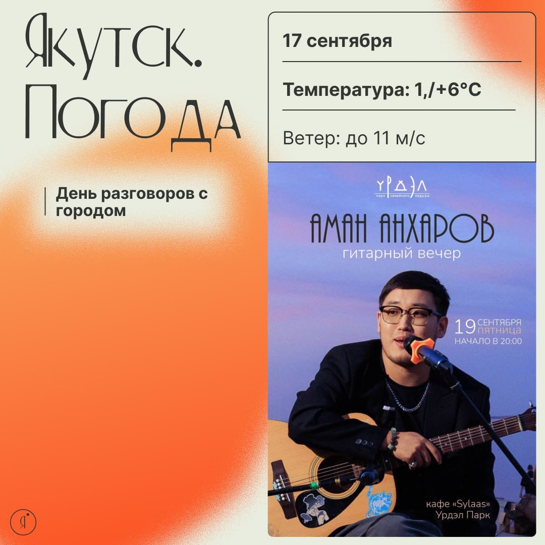 Доброе утро, встречаем среду 🤩 Готовы ли вы к душевному вечеру под гитару? @yrdel_park приглашает на бесплатный гитарный вечер с Аманом Анхаровым в Урдэл Парке. Что ждёт: • Живые выступления и любимые хиты • Уютная атмосфера и тёплые встречи • Обновлённое меню кафе Sylaas и романтичный вид на огни вечернего города 🤩19 сентября, пятница| 20:00 Кафе Sylaas, Урдэл Парк 🤩Вход свободный Возьмите с собой хорошее настроение и друзей 🤩 Online Якутия | Подписаться