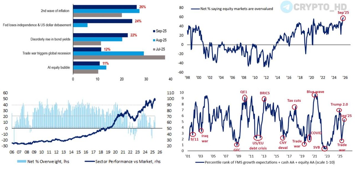 #рекорды 🐃 Bank of America отмечает рекордный с февраля 2025 года оптимизм у инвесторов (сентябрьский опрос) Опрос управляющих фондами, которые контролируют активы на $426,000,000,000+ ▫️Все больше управляющих увеличивают долю акций в портфелях – самый высокий уровень интереса к фондовому рынку с февраля. ▫️Оптимизм по росту мировой экономики резко вырос – лишь 16% респондентов ожидают замедления в ближайший год. ▫️Доля кэша в портфелях снизилась до 3,9% – минимум за год, растет аппетит к риску. ▫️58% респондентов считают акции переоцененными (особенно американские) – рекорд. ▫️Главный «перегруженный трейд» – лонг по «Великолепной семерке», на втором месте – золото. ▫️Большинство опрошенных ожидают «мягкую посадку» экономики США, рецессия маловероятна. ▫️Ключевые риски: инфляция, слабость доллара, давление политиков на мировые ЦБ и торговые войны. ▫️47% респондентов ожидают по меньшей мере четырех снижений ставки ФРС в течение следующих 12 месяцев. Ранее: августовский опрос