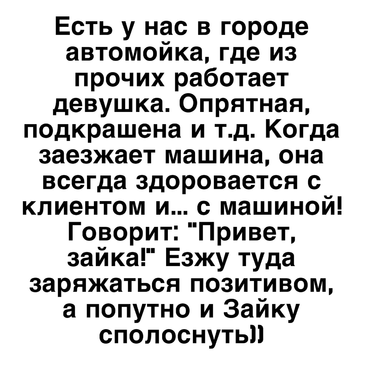Есть у нас в городе автомойка, где из прочих работает девушка. Опрятная, подкрашена и т.д. Когда заезжает машина, она всегда здоровается с клиентом и... с машиной! Говорит: "Привет, зайка!" Езжу туда заряжаться позитивом, а попутно и Зайку сполоснуть))