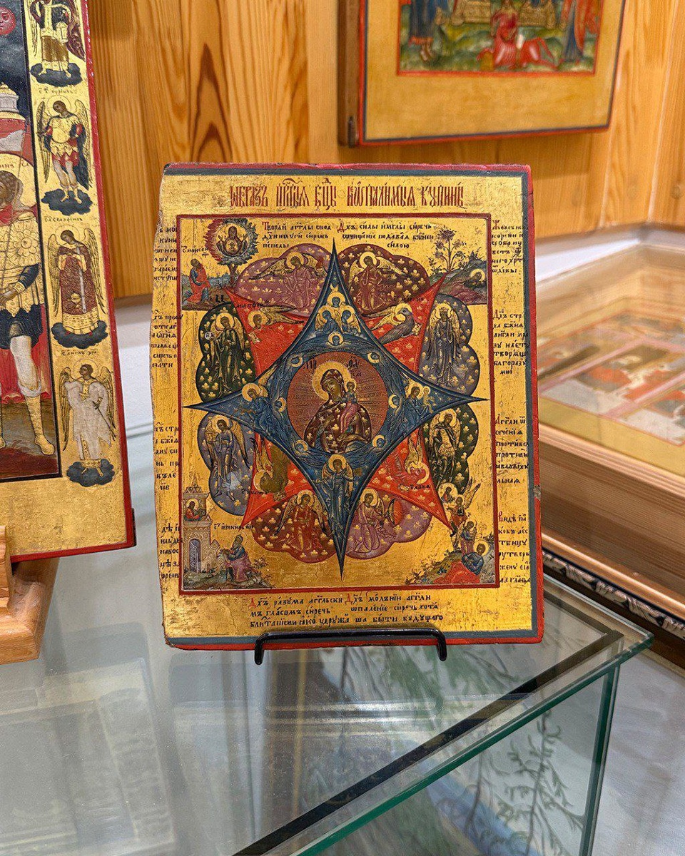 Одним из ветхозаветных прообразов, указывавших на Божию Матерь, была неопалимая купина – тот куст, который Моисей видел горевшим в огне, но не сгоравшим. Эта купина знаменовала собой непорочное зачатие Богоматерью Христа от Духа Святого. Став Матерью, Она осталась Девой: до рождества Дева, в рождестве Дева и по рождестве Дева. "Неопалимая Купина" изображалась иногда в виде объятого пламенем куста, над которым возвышается Богоматерь с Младенцем на руках, но гораздо чаще на иконе можно видеть восьмиугольную звезду, окружающую Божию Матерь. Звезда составлена из двух четырехугольников, один из которых окрашен в красный цвет – образ пламени, другой, напоминая зелень таинственного куста, – в зеленый. В лучах синего (или зеленого) цвета изображается служение ангелов Богоматери и поклонение небесных сил чудесному рождению Бога от Девы. Она окружена архангелами и ангелами стихий: грома, молнии, росы, ветра, дождя, мороза и мглы. Каждый ангел держит соответствующий “атрибут”, как чашу, фонарь,