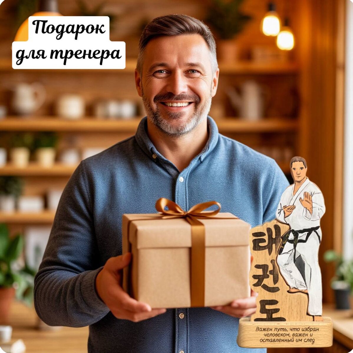 Для тренера идеально подойдёт портретная статуэтка — деревянный сувенир с детальной прорисовкой лица и элементов одежды, который можно персонализировать гравировкой с именем и памятной надписью. Такой подарок будет уникальным и душевным, он подчеркнёт уважение и благодарность за труд и внимание к деталям.