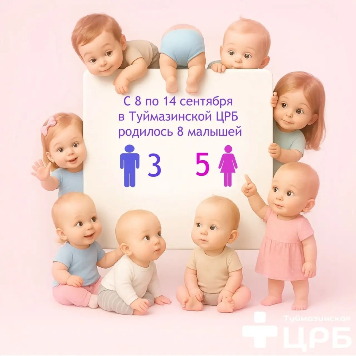 С 8 по 14 сентября в Туймазинском роддоме родилось восемь малышей. Среди них три мальчика и пять девочек. Новость опубликовали в соцсетях Туймазинской ЦРБ.