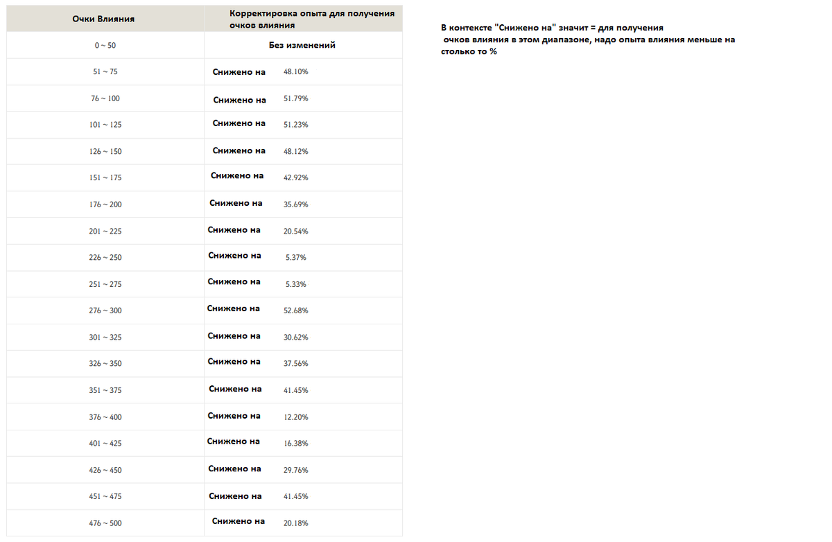 Очки опыта, необходимые для повышения уровня влияния на каждом уровне, были скорректированы следующим образом: