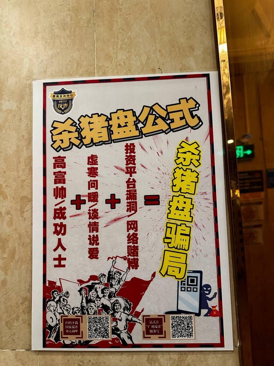 Смысл неожиданный, плакат предупреждает о так называемой «схеме обмана “убойная свинья” (杀猪盘, shā zhū pán) — это вид интернет-мошенничества. Типа откармливают жертву лаской, а потом режут 🐷