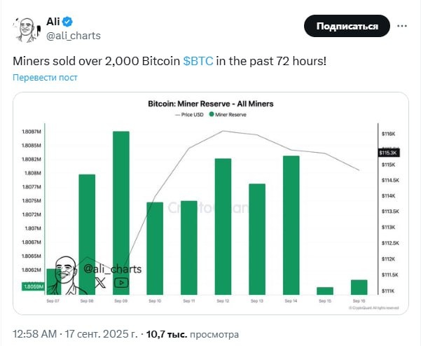 За последние 72 часа майнеры продали более 2000 биткоинов BTC.