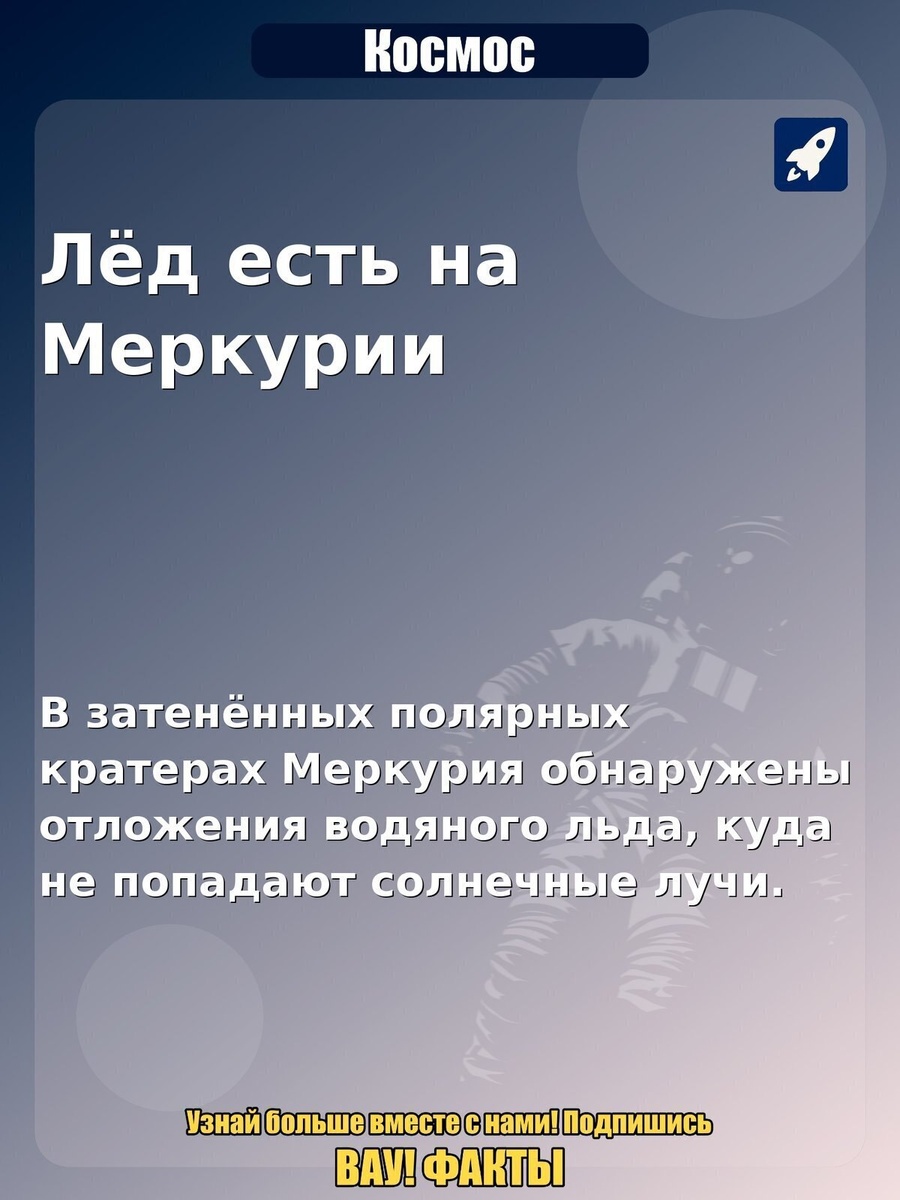 Лёд есть на Меркурии. В затенённых полярных кратерах Меркурия обнаружены отложения водяного льда, куда не попадают солнечные лучи. Интересный факт по теме «Космос»: Лёд есть на Меркурии. Почему так: В затенённых полярных кратерах Меркурия обнаружены отложения водяного льда, куда не попадают солнечные лучи.. Поделитесь в комментариях, знали ли вы об этом и стоит ли делать продолжение по теме. #космос #факты #астрономия