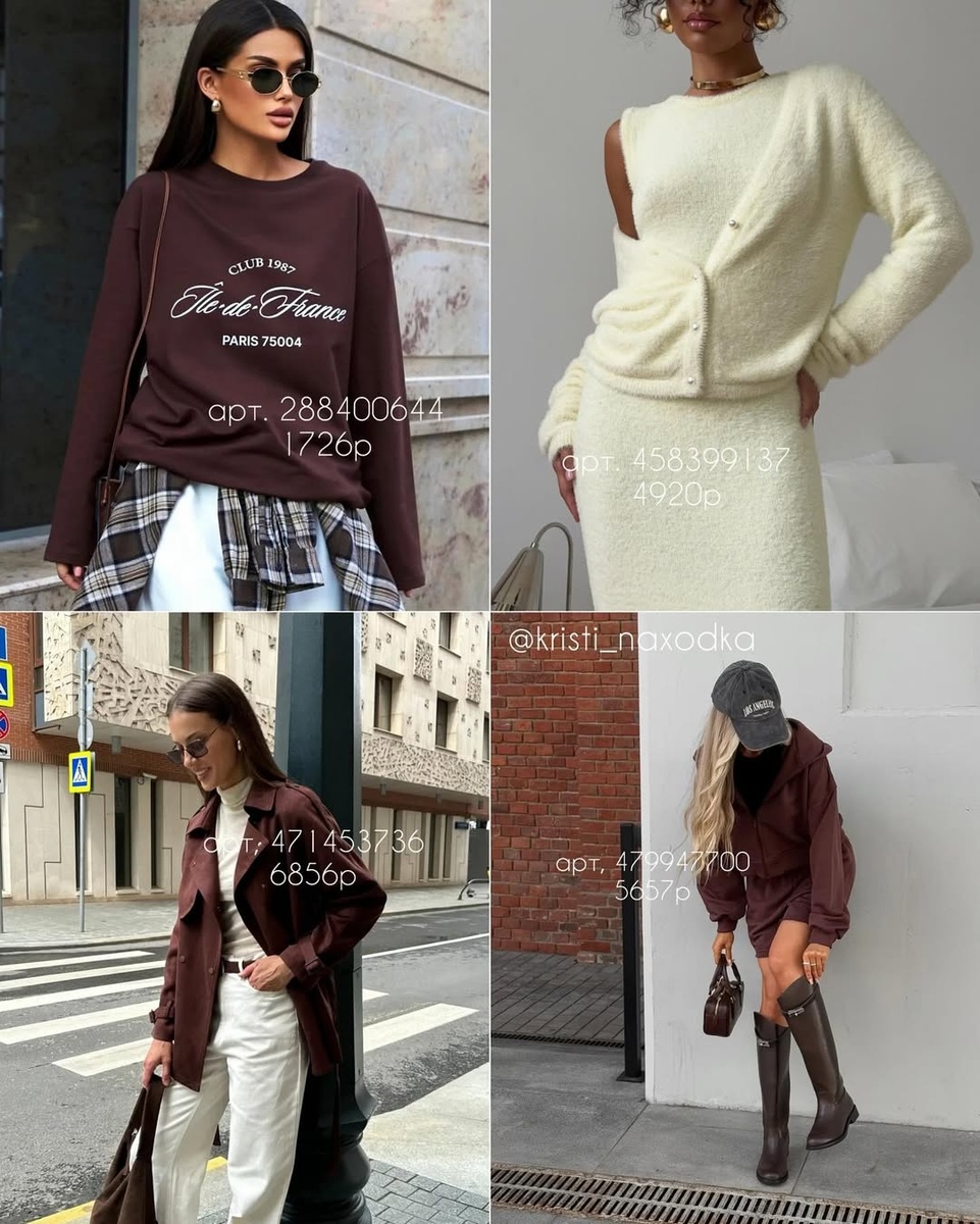 В этих образах — всё, за что мы любим осень: тёплые оттенки какао и бордо, переливы твида, пушистые трикотажи и выверенная геометрия пиджаков. Собирайте образы вокруг одной акцентной вещи (твидовый жакет, комплект «зефир» или лодочки с золотым носиком), поддерживайте палитру аксессуарами и играйте вертикалями — открытая спина, расстёгнутые борта, V-вырезы. Так любой комплект будет выглядеть дороже и гармоничнее.
