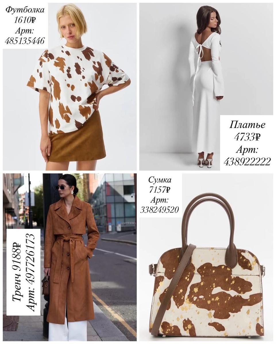 Эта подборка — про три мощных настроения сезона: вестерн с коровьим принтом, мягкая пастель и минимализм, землистая палитра с дерзкими казаками. Ниже я разобрала каждую вещь с WB по артикулу, указала посадку, фактуру, лучшие сочетания и дала маленький трюк стилиста, который «докручивает» образ.