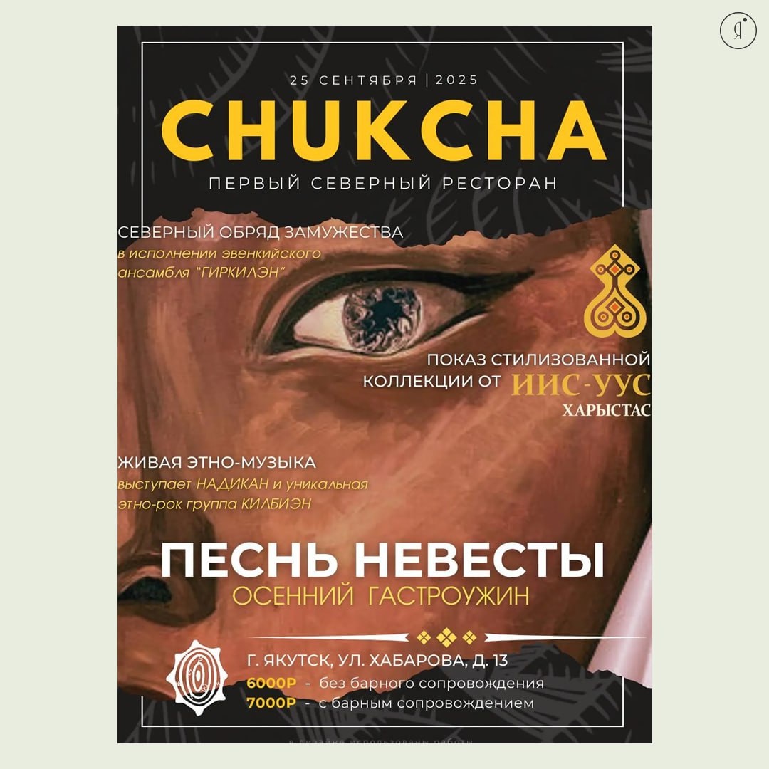 Осенний гастрономический ужин «Песнь невесты» #Вечером Что вас ждет: - Уникальный ужин, состоящий из 4х курсов - Театрализованное представление «Северный обряд замужества» в исполнении эвенкийского ансамбля ГИРКИЛЭН @girkilen_ - Живая этно-музыка от северной певицы NADIKAN @nadikan_varlamv - Выступление этно-рок группы КИЛБИЭН @kilb.ien - Показ стилизованной коллекции от бренда ИИС-УУС ХАРЫСТАС @iis_uus_xaristas aristas В меню: 🤩 Салат с олениной су-вид, пряной грушей с цитрусовыми соусом и голубым сыром + белое сухое 🤩 Солянка с копчёным оленем + тыквенная настойка 🤩 Говяжьи щечки с грибным перлотто и выдержанным сыром + красное сухое 🤩 Десерт ром-баба + настойка с малиной 🤩 Осенний чай с яблоком и корицей 25 сентября | 19:00 Ресто-бар «Chukcha», Хабарова, 13 6000-7000 руб. +7924769500 Online Якутия | Подписаться