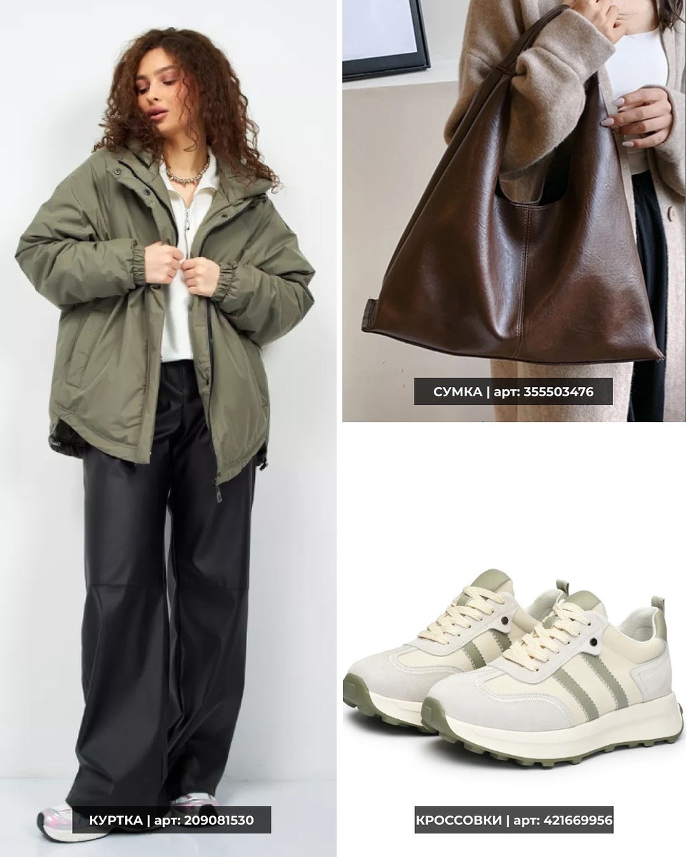 Шесть вещей — а возможностей десятки. Держите палитру в трёх тонах (олива + молочный + шоколад), стройте вертикали (расстёгнутые борта, V-вырез, вытянутый нос) и миксуйте фактуры: матовый пуховик, мягкая замша, гладкая «кожа», пушистый трикотаж. Так любой комплект из этой мини-капсулы WB будет выглядеть продуманно и «дорого» — без усилий.