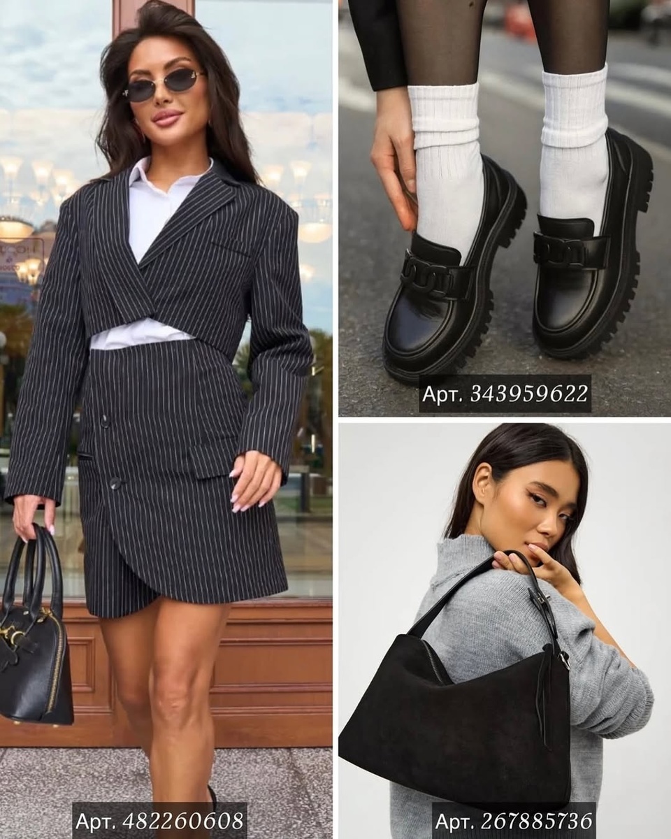 - Городской power-look: костюм в полоску 482260608 + лоферы 343959622 + хобо 267885736.