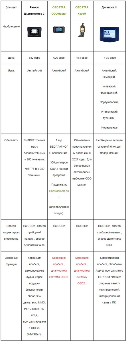 На рынке профессиональной коррекции одометров существует несколько надёжных инструментов, зарекомендовавших себя как надёжный выбор. Наиболее известными являются Yanhua Digimaster 3, OBDSTAR ODO Master , OBDSTAR X300M и Digiprog III. Каждый инструмент предлагает уникальный набор функций, разработанных для удовлетворения различных потребностей пользователей. Ниже представлено наглядное и объективное сравнение, которое поможет вам выбрать наиболее подходящее устройство. Сравнение 4 лучших инструментов для коррекции одометра Покрытие транспортного средства : Загрузка списка автомобилей OBDSTAR ODO Master : https://www.obdstartools.eu/upload/service/25030617413331791577.zip Загрузка списка автомобилей OBDSTAR X300M : https://www.obdstartools.eu/upload/service/24120617334749392873.zip Ключевые различия Почему стоит выбрать OBDSTAR X300M и ODO Master? За исключительную ценность, надежность и совместимость с будущими версиями мы настоятельно рекомендуем OBDSTAR X300M и OBDSTAR ODO Master . X