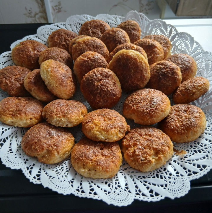 ✔ 360 г творога 1%; ✔ 150 г «разрешенной» муки (у меня семечки подсолнечника и геркулес в равных частях, перемолотые в кофемолке); ✔ 1 яйцо (С0); ✔ 10 г разрыхлителя; ✔ Соль – щепотка; ✔ Сахарозаменитель - по вкусу; ✔ Корица для посыпки или обвалки. Смешать все ингредиенты (кроме корицы). Скатать важными руками шарики, выложить на противень, застеленный пергаментом, приплюснуть, посыпать корицей (или обвалять в ней). Выпекать 15-20 минут при 200-х градусах. КБЖУ на 100 г - 222/19,0/10,2/12,3. Рецепт на странице Автор рецепта – Татьяна Симакова Расчёт КБЖУ сделан с помощью Telegram-чат-бота https://t.me/vesipitaniebot © Почтенный возраст Online и Рецепты для диабетиков
