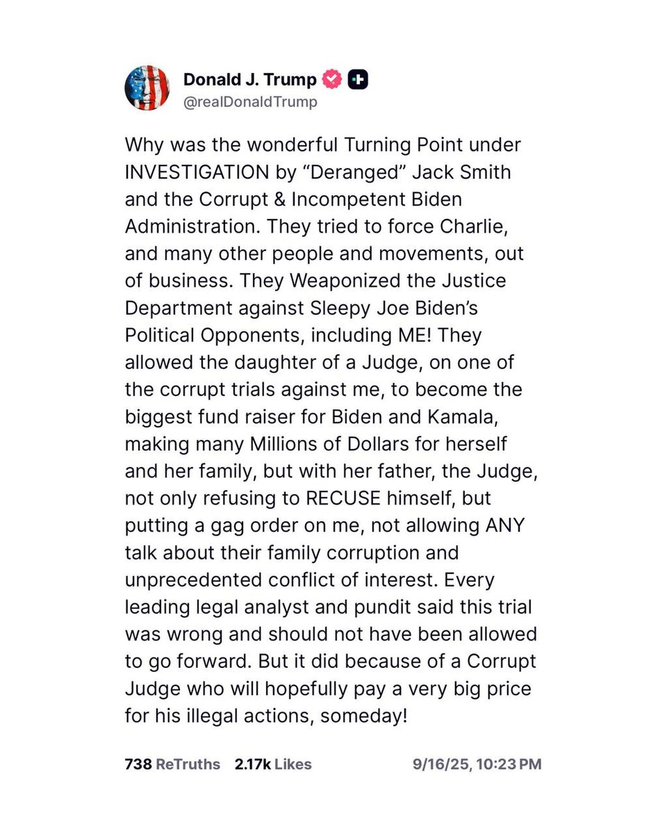 Trump asks about the investigation into Charlie Kirk’s TPUSA by the Biden DOJ: ‘They WEAPONIZED the Justice Department against Sleepy Joe Biden’s Political Opponents’