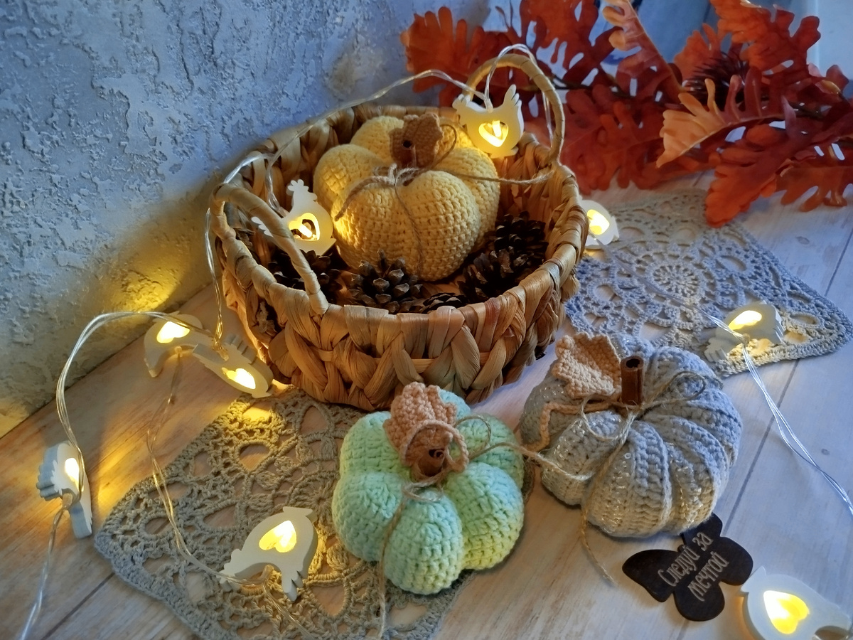 Связались вот такие теплые, уютные тыковки с палочками корицы. Работа не сложная, но придаёт дому уют и тепло