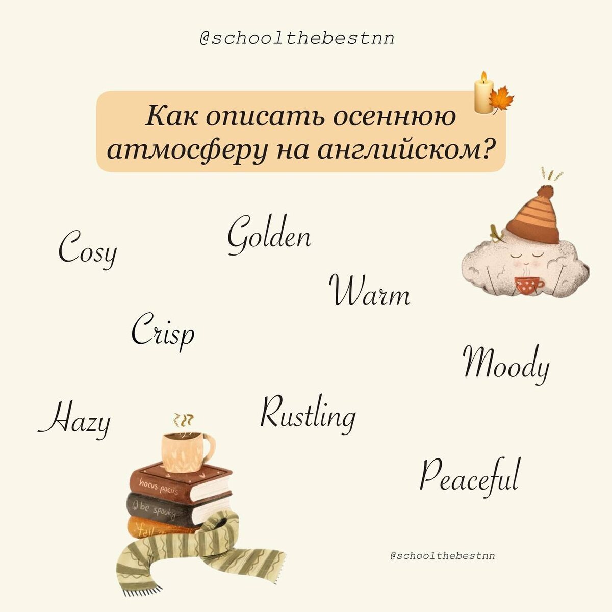 Осень — это не просто время года, а целая палитра чувств и красок. Хотите рассказывать о ней на английском так же красочно, как и на русском? Ловите подборку атмосферных прилагательных! 🍂 Cosy — уютный The room felt cosy with the candles lit. 🍂 Crisp — свежий The air felt crisp in the morning. 🍂 Golden — золотой The forest looked golden. 🍂 Warm — теплый A warm drink is perfect for a chilly day. 🍂 Moody — мрачный The grey sky made the day feel moody. 🍂 Rustling — шуршащий The rustling of leaves was relaxing. 🍂 Peaceful — спокойный Autumn mornings feel peaceful. 🍂 Hazy — туманный The morning was hazy and cool.