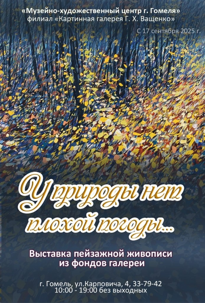 У ПРИРОДЫ НЕТ ПЛОХОЙ ПОГОДЫ Филиал «Картинная галерея Г. Х. Ващенко» ГУ «Музейно-художественный центр г.Гомеля» продолжает знакомить Вас со своими фондами✨ 💥Сегодня начинает работу выставка "У природы нет плохой погоды". 🖼Выставка познакомит с пейзажной живописью. Природа всегда вдохновляла и продолжает вдохновлять живописцев своими разными состояниями. В выставку вошло 17 робот художников разных поколений. В числе представленных имен Дмитрий Аленик , Николай Казакевич, Владимир Рыкалин, Василий Пешкун, Михаил Крот, Виктор Тихонов, Станислав Дьяконов и др. 📆с 17 по 28 сентября 📍ул. Карповича, 4