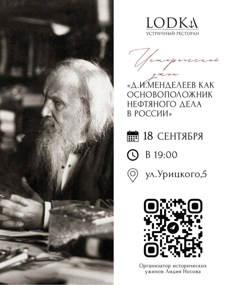 Друзья, приглашаю вас на гастрономичный исторический ужин, где можно будет попробовать ту самую «уху с нефтью»! 🤩 Этот ужин приурочен к масштабному форуму TNF, который будет проходить в Тюмени 15-18 сентября 2025 года https://oilgasforum.ru 🛢Тема: «Д.И.Менделеев как основоположник нефтяного дела в России» 📆 Дата: 18 сентября (четверг) в 19:00 📍 Место: ресторан «Lodka» на ул.Урицкого, 5. Вы услышите об интересных фактах из биографии великого ученого и разработках в сфере добычи, транспортировки и переработки нефти, и, конечно же, о гастрономических предпочтениях Дмитрия Ивановича. А также в программе традиционно будут исторические загадки и приятные подарки 🎁 Стоимость участия: 7000₽ с персоны (включены пять курсов блюд, алкогольные и безалкогольные напитки). ✅ Бронь мест по номеру: 8-912-923-85-02 (Лидия)