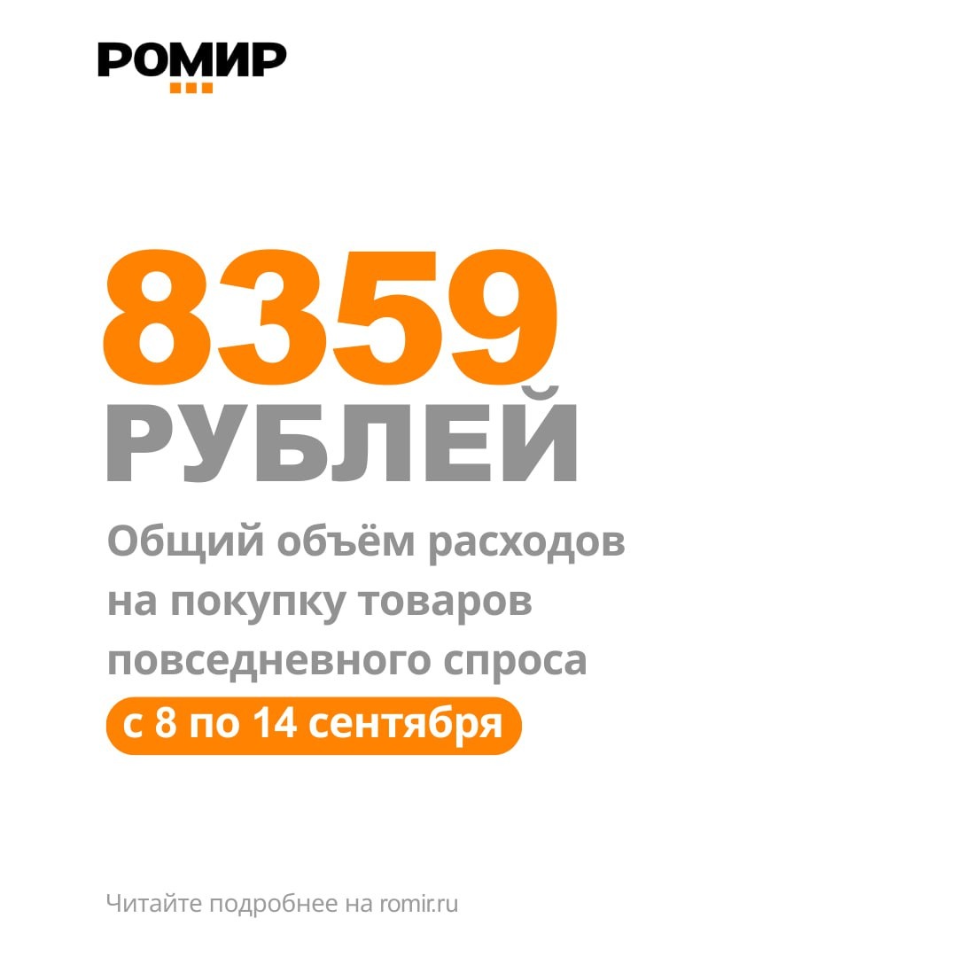 8359 рублей потратила в среднем на продукты питания и товары повседневного спроса среднестатистическая российская семья на неделе с 8 по 14 сентября, что на 233 руб. (2,86%) больше, чем неделей ранее. Относительно аналогичной недели прошлого года объем недельных расходов вырос на 594 руб., или на 7,65%. 🔸 Рост расходов связан с сезонными покупками: население активно запасается овощами и фруктами, в том числе делаются заготовки к зиме. #индекснедельныхрасходов #индекспокупательскойактивности @romir_real