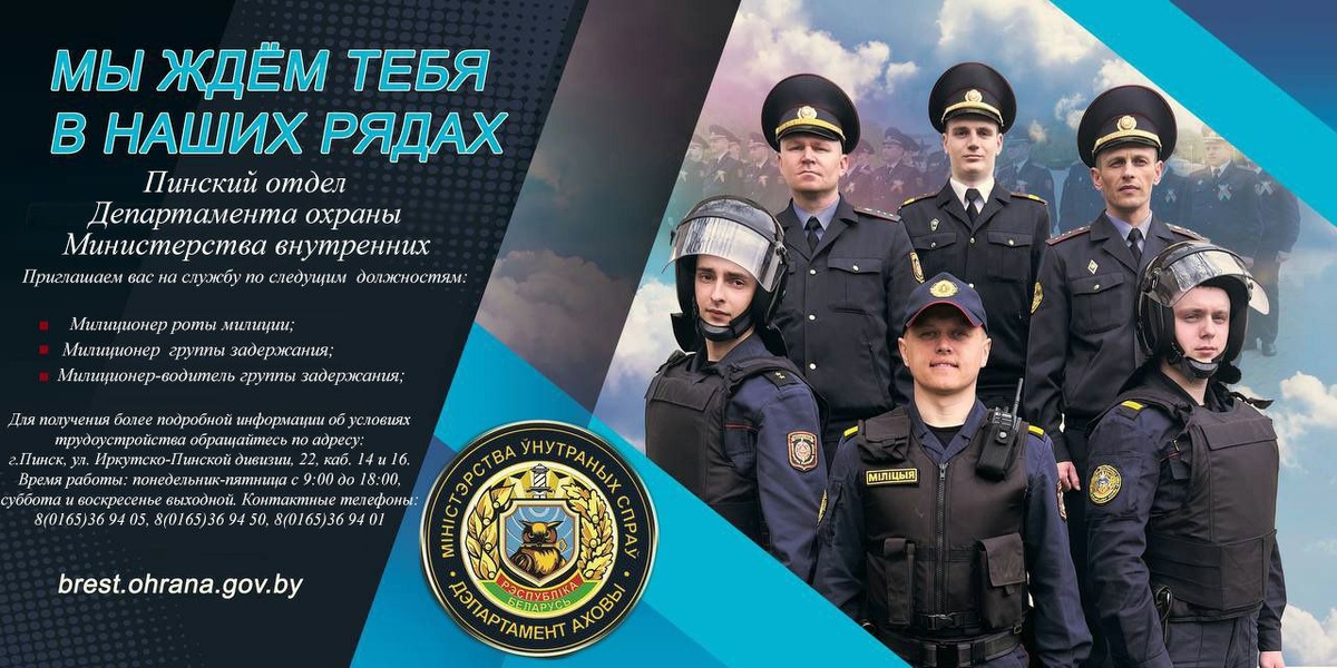 ✅Учащиеся 11 классов, изъявившие желание поступать в УО "Академия Министерства внутренних дел" и УО "Могилевский институт Министерства внутренних дел" ➡️до 15 апреля 2026 года могут обратиться в Пинский отдел Департамента охраны Министерства внутренних дел для проведения собеседования и оказания практической помощи в поступлении. ➡️Для более подробной информации обращаться по адресу: г. Пинск, ул. Иркутско-Пинской дивизии, д. 22, каб. 14, 16. ✅Время работы: понедельник - пятница с 09.00 до 18.00, суббота, воскресенье - выходной. ➡️Контактные телефоны: 80165369405, 80165369450, 80165369452, 80447118917 📍📍@Пинский Вестник ЮТУБ | САЙТ| ИНСТ | ВК | ОК | ФЕ | Прислать новость
