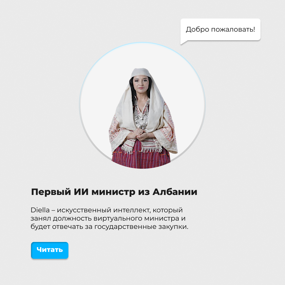 В сентябре 2025 года премьер Албании Эди Рама объявил о создании Diella – искусственного интеллекта, который занял должность виртуального министра и будет отвечать за государственные закупки. Этот шаг преподносится как мировой прецедент назначения ИИ на руководящую позицию. С начала 2025 года Diella функционировала в качестве цифрового помощника на платформе e-Albania, облегчая доступ граждан и предприятий к онлайн-госуслугам. Теперь функциональность ИИ расширяется: ему предстоит анализировать поступающие предложения и постепенно переходить к самостоятельному принятию решений при проведении тендеров. Основная задача проекта – уменьшить вероятность коррупционных действий, ускорить процессы и обеспечить большую открытость государственных закупок. По словам Рамы, передача полномочий от министерств к Diella сделает торги абсолютно честными, а все операции - полностью прозрачными.