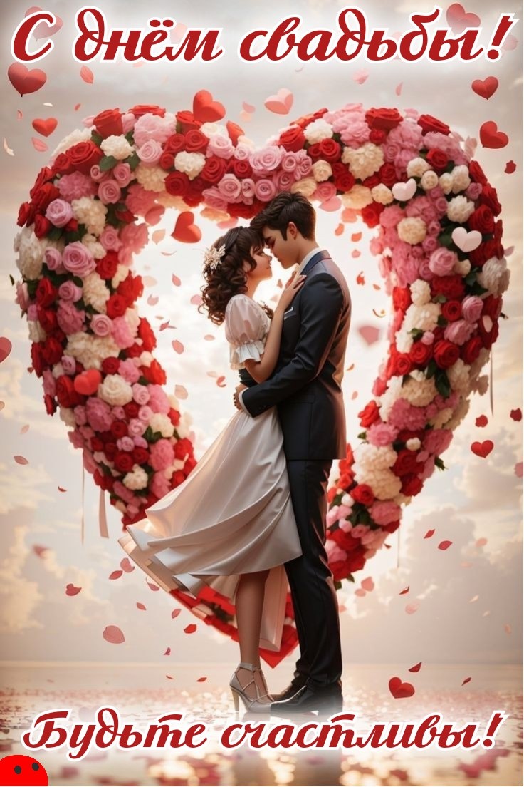 С днём свадьбы! Будьте счастливы ❤️ Пусть любовь и гармония всегда будут в вашем доме ❤️✨, а счастье и улыбки сопровождают каждый день! 😊🌹 Желаю вам много ярких моментов, взаимопонимания и бесконечной любви! 💑