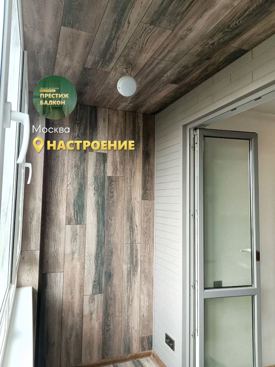 Здесь — игра текстур ламината и стенового паркета из липы. Все выполнено "под ключ": остекление, утепление, отделка, электрика — полный комплект, как мы любим.