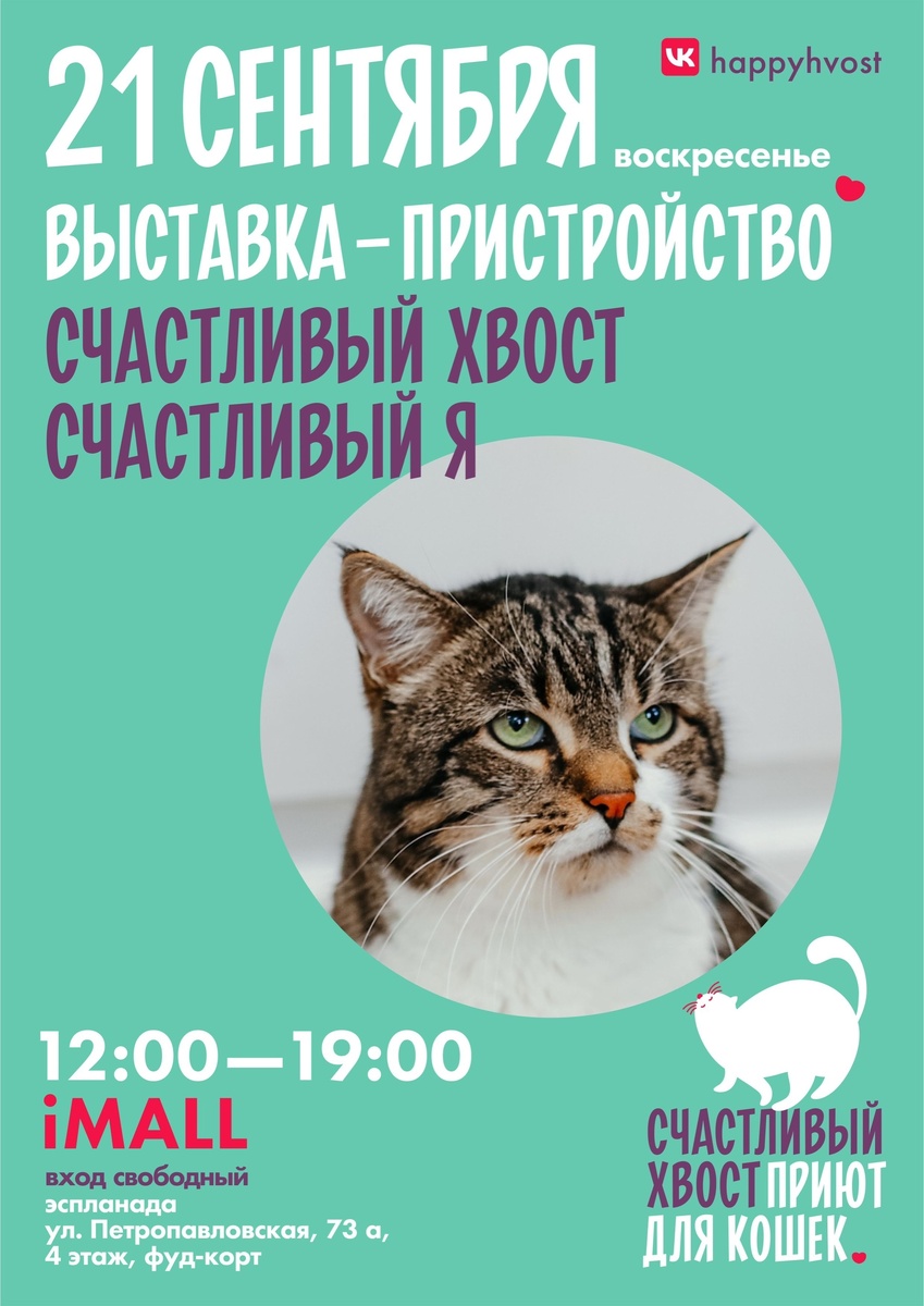 Приглашаем вас на выставку котиков в IMALLе 🐈 Там вы сможете полюбоваться и пообщаться с пушистыми представителями нашего приюта. А того, кто западет в сердечко забрать в свою семью❤ Так же, на выставке будет представлен красивый и стильный мерч нашего приюта. Вы сможете выбрать себе что-то для души! Котики прихорашиваются и будут ждать встречи со своим потенциальными хозяевами 🐈 21 сентября, в воскресенье, на 4 этаже IMALLа с 12.00 до 19.00, мерч, котики и мы будем вас ждать ❤ Если вы давно хотели друга, то хватайте🙂 переноску и приходите на встречу со своим счастьем! Вход свободный. Просто, бери и люби! До встречи 😉