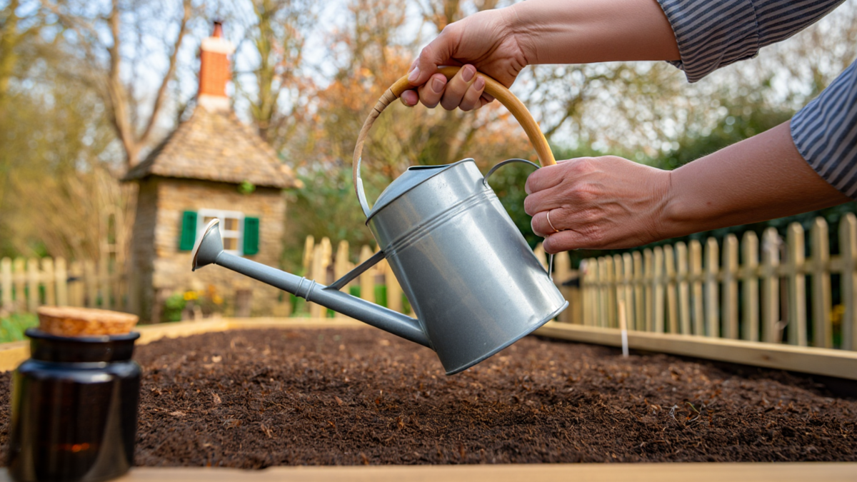 Дальше беру лейку на 10 литров, развожу пузырёк (дозировка указана всегда на бутылочке, но обычно хватает колпачка). Тщательно проливаю грядку. Важно не скупиться на воду. Почва должна промокнуть хотя бы на 10–15 сантиметров.