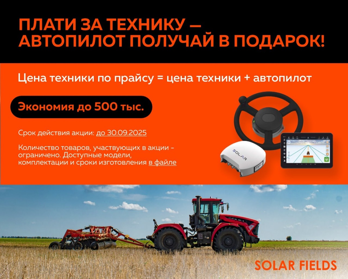 🔥🔥🔥🔥 🚜 Плати за технику — автопилот в подарок! Купи технику SOLAR FIELDS и получи 🎁 систему параллельного вождения с годовым спутниковым сигналом — бесплатно. 💰 Экономия — до 500 000 ₽ сразу и до 1,3 млн ₽ в год за счёт точности и снижения затрат. ⏳Акция действует до 30.09.2025. Количество техники ограничено. 👉Успей забрать свою выгоду! Подробности акции в документе ⬇️