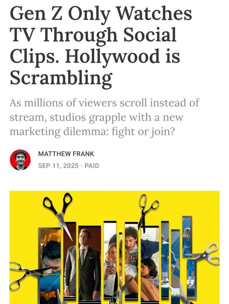Тиктокеры грабят Голливуд — киностудии теряют миллионы, пока зумеры смотрят фильмы кусками в нарезках и обсуждают их в соцсетях вместо похода в кино. Исследования показывают: 71% молодёжи узнаёт о премьерах именно из вертикальных видео, а не из трейлеров или афиш. Нарезки вроде бы привлекают внимание, но одновременно приучают аудиторию потреблять кино 30-секундными фрагментами. В итоге подростки включают серию или фильм и бросают на середине — привычка к длинному формату у них просто не формируется.
