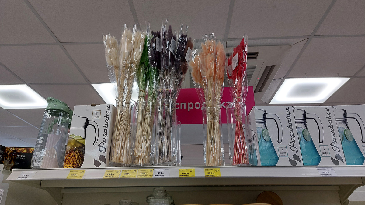 На верхней полке в вазах, мой взгляд привлекает большое количество необычных цветных светлых, ярких и темных сухоцветов, стоимостью 239 рублей за букет.