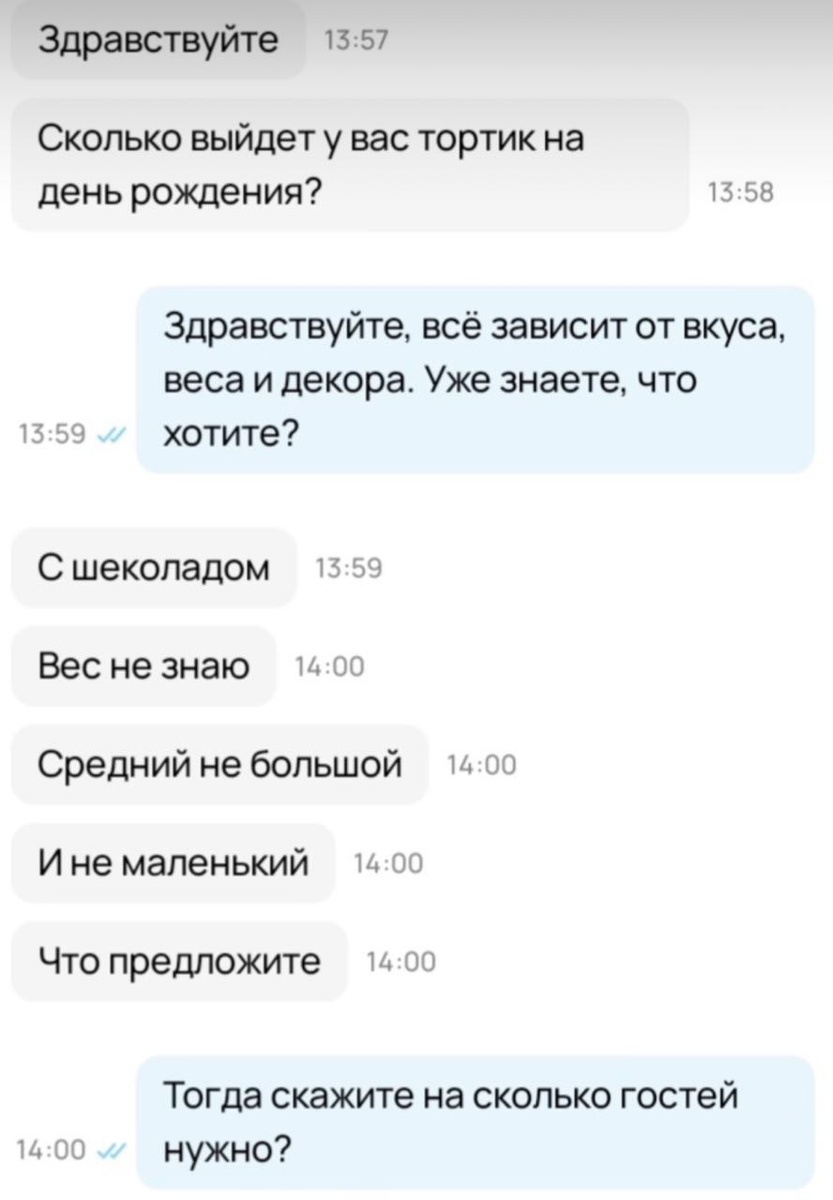"Здравствуйте! Поделюсь перепиской с заказчиком, которая случилась на заре моей работы домашним кондитером. Теперь я понимаю, как взаимодействовать с мужчинами, когда они оформляют заказ. Но на первых порах было общение складывалось очень сложно. Например, такой диалог мог надолго вывести меня из колеи. Я не знала, как правильно общаться с подобными клиентами. Сейчас я бы не стала задавать так много вопросов, просто отправила бы 2 картинки дизайна и предложила бы на выбор 2 начинки. Но в тот момент у меня было на уме только одно: