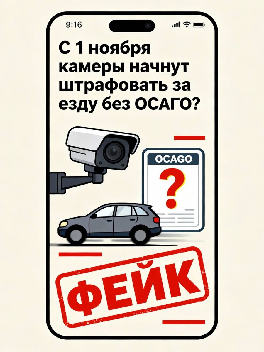 🚨 СМИ наделали шуму: якобы с 1 ноября камеры начнут автоматически ловить водителей без ОСАГО, а штрафы будут приходить хоть каждый день — 💸 800₽ за первый раз и до 5000₽ — за повторный. Но! Это всё — фейк.🤥 Сенатор Артём Шейкин https://t.me/senator_sheikin (Совфед) официально заявил: ❗️ «Информация о том, что с 1 ноября в России в автоматическом режиме начнётся выявление автомобилей без полиса ОСАГО, преждевременна. Вопрос пока на стадии обсуждения. Решений — нет». 📌 Что реально происходит: ✅Камеры и правда могут начать проверять ОСАГО в автоматическом режиме, ✅Но пока это только на уровне обсуждений и поручений, ✅Никаких официальных штрафов "800 и 5000" — не утверждено, ✅Штрафы каждый день? Нет, никто такую схему пока не одобрял. НО…это не значит, что можно ездить без ОСАГО 🚓 Галина Робертовна - Специалист по страхованию 🍀