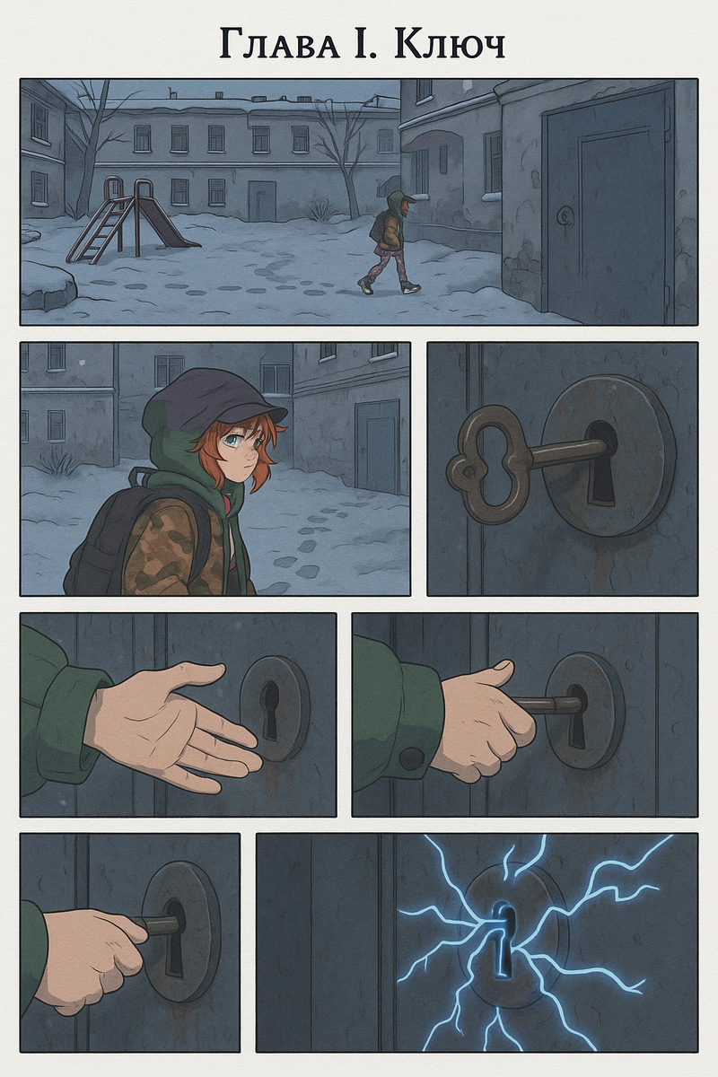 Москва. Зимний вечер. Снег падает хлопьями, как будто сам город пытается скрыть что-то важное под белым покрывалом. Алиса возвращалась из школы коротким путём через старый двор — тот самый, где всегда тихо, даже когда вокруг гремит Третье кольцо. Там были облупленные стены, заржавевшие качели и странная железная дверца, которую никто никогда не открывал. В тот вечер она заметила в замочной скважине ключ. Древний, тяжёлый, с выгравированными на зубцах символами. Сердце Алисы ударило чаще. Никто во дворе его не видел — только она. Она дотронулась до холодного металла, и мир изменился. Дверца открылась, и Алиса шагнула внутрь. Москва исчезла. Она оказалась в коридоре, где дома вытягивались, словно корни деревьев, а фонари превращались в фигуры стражей с пустыми глазами. Улицы гудели, шепча легенды. Алиса прошла по мостовой, которая сама складывалась под её ногами. Вдруг прямо перед ней вспыхнула тень, обернувшись женщиной в старинном платье.