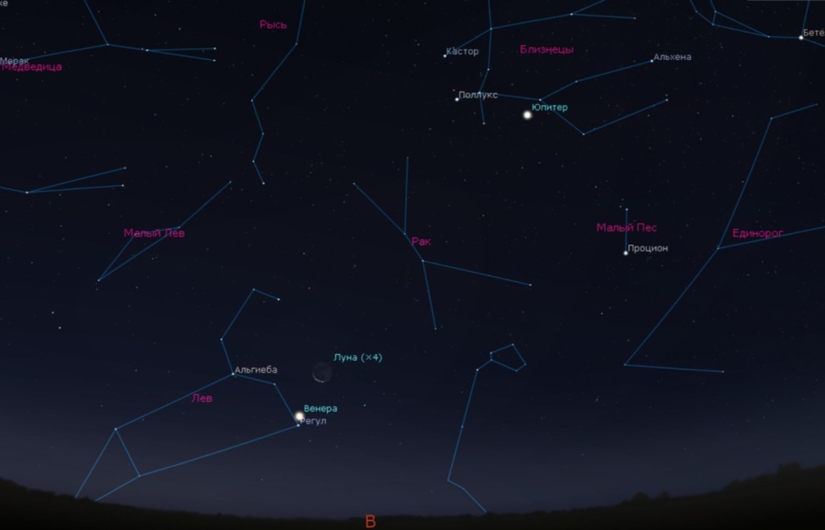 Как сообщили специалисты Уфимского планетария, ранним утром в созвездии Льва произойдет встреча Венеры и Луны, двух наиболее ярких объектов на ночном небосклоне. Примерно за 60 минут до восхода солнца их можно будет увидеть в восточной части неба, невысоко над линией горизонта.