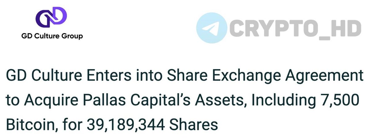 π GD Culture Group (GDC) ΠΏΠΎΠΊΡΠΏΠ°Π΅Ρ 7500 BTC ($873m) ΡΠ΅ΡΠ΅Π· ΡΠ΄Π΅Π»ΠΊΡ Ρ Pallas Capital β ΡΠ΅Π»ΠΈΠ· ΠΠΎΠΌΠΏΠ°Π½ΠΈΠΈ ΠΏΠΎΠ΄ΠΏΠΈΡΠ°Π»ΠΈ ΡΠΎΠ³Π»Π°ΡΠ΅Π½ΠΈΠ΅ ΠΎΠ± ΠΎΠ±ΠΌΠ΅Π½Π΅ Π°ΠΊΡΠΈΡΠΌΠΈ (share exchange agreement). β€ GDC Π²ΡΠΏΡΡΠΊΠ°Π΅Ρ 39,200,000 Π½ΠΎΠ²ΡΡ