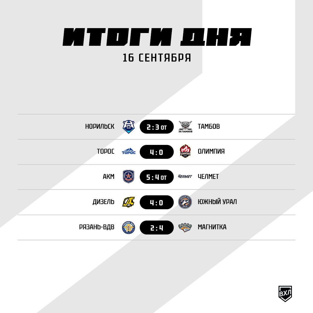 Итоги ВХЛ 16 сентября "Торос" и "Дизель" выиграли свои матчи всухую, а в Туле АКМ и "Челмет" порадовали болельщиков результативным хоккеем, в котором сильнее были туляки. 📸ВХЛ @nhockey