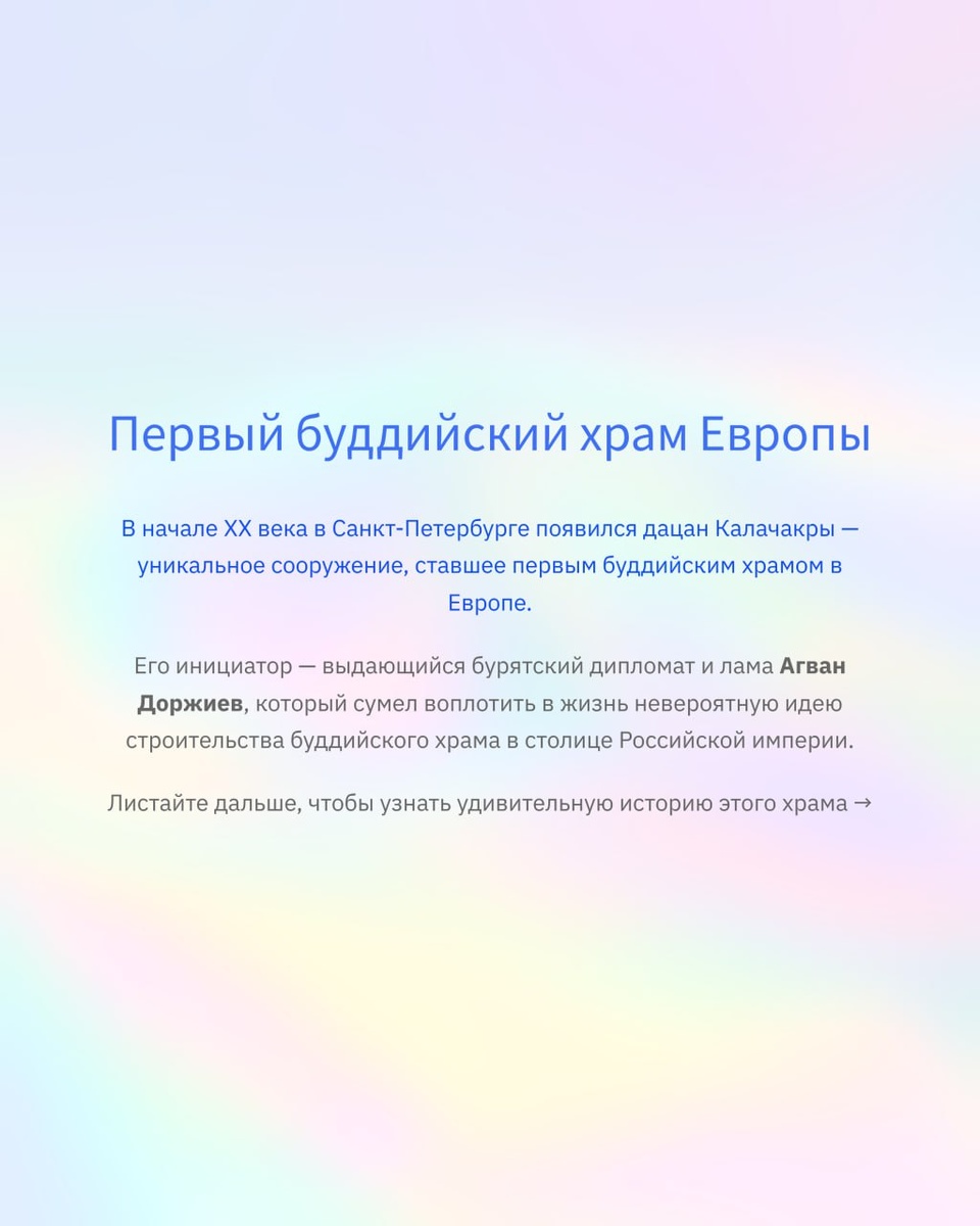 Буддийский храм Калачакры в Санкт-Петербурге — первый буддийский храм Европы. Построен в 1909–1915 гг. по инициативе Агвана Доржиева, советника Далай-ламы XIII. Архитектор Гавриил Барановский, росписи создавал Николай Рерих. ⚖️ Храм пережил разграбления и репрессии, но был восстановлен. Сегодня это действующий центр буддизма в России и памятник уникального культурного диалога. 👉 Больше историй о великих бурятах и буддизме в России — в канале https://t.me/universe_buryat