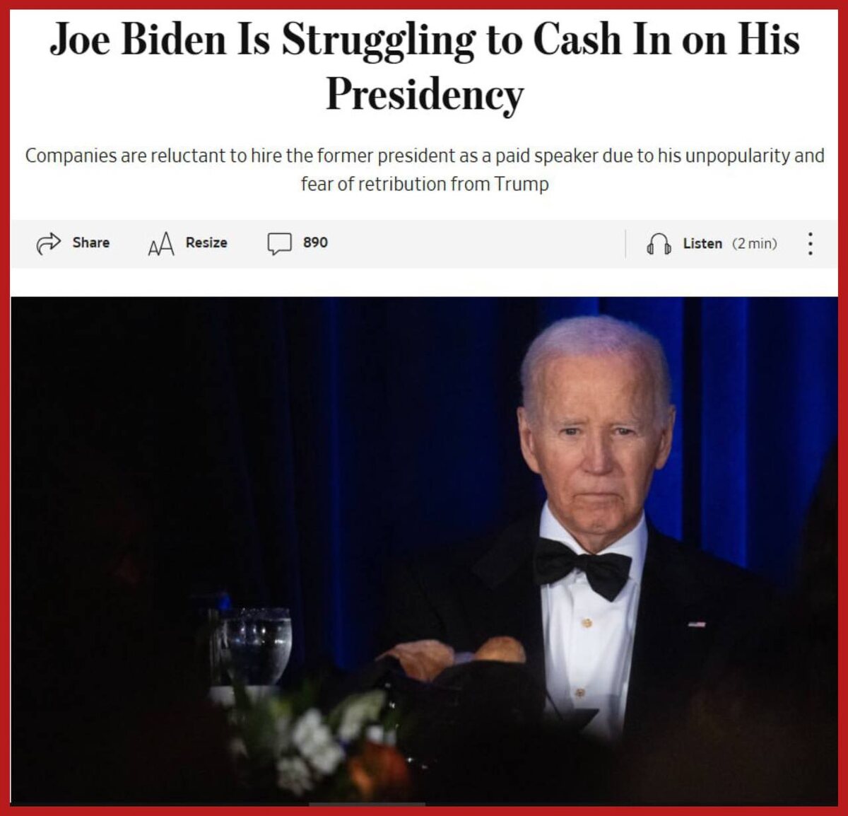 Байдену оказалось непросто монетизировать свое президентство: компании не спешат приглашать его для публичных выступлений, а популярность экс-президента среди союзников снизилась. Желающих заказать выступление за $300–500 тысяч практически нет и вся надежда на $10 млн за мемуары. Но даже эта сумма выглядит довольно скромно на фоне гонораров экс-президента Барака Обамы, который получил за книгу $60 млн. Вдобавок Байден борется с раком простаты.