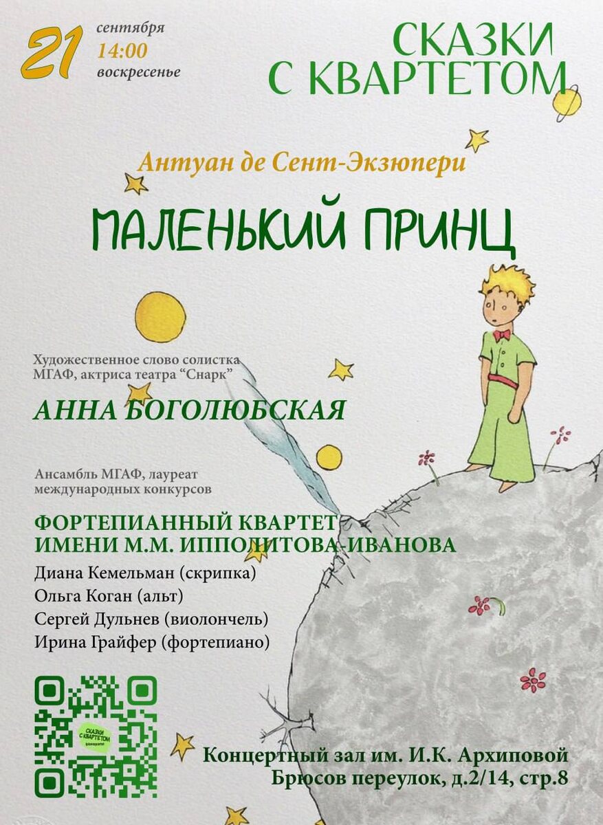 Премьера на сцене Концертного зала им. Архиповой - Литературно-музыкальная постановка с живой музыкой МАЛЕНЬКИЙ ПРИНЦ» (0+) Впервые на сцене Концертного зала им. Архиповой пройдёт серия увлекательных литературно-музыкальных программ для детей, основанных на лучших и любимых сказках и редких произведениях выдающихся композиторов. Цикл «Сказки с квартетом» более 10 лет радует маленьких зрителей, особенное звучание душевным представлениям придаст наше камерное пространство. Захватывающие сказочные истории дадут возможность детям поразмышлять о самых важных вещах, а завораживающая музыка - почувствовать смыслы, которые кроются за словами. 21 сентября в 14:00 пройдёт показ постановки«Маленький принц», основанной на знаменитой повести Антуана де Сент-Экзюпери. Удивительная история, полная загадок и вопросов, на которые даже в зрелом возрасте непросто найти ответы. История о том, как можно и нужно уметь любить, о том, что «самого главного глазами не увидишь», потому что «зорко одно лишь сер